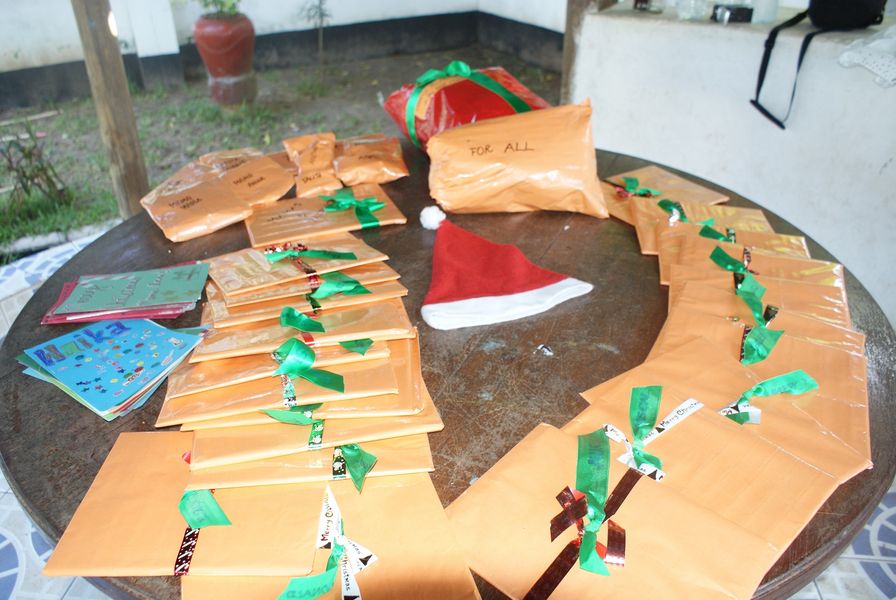 In the late afternoon when the tables were set, the kids showered and dressed up in their Sunday clothes, we started our little celebration. Together with our former volunteer Jenna each child had made a little book about themselves, which they now presented to all of us. Suddenly they were shy and so quiet it made us smile. Proudly they took their little presents, schoolbooks Monika had bought for them from another donation. Thank you!