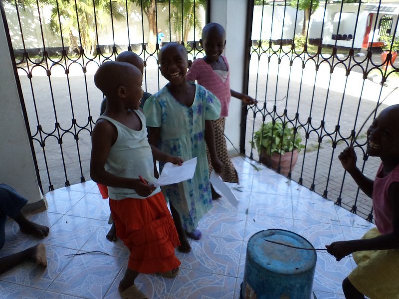Below pictures: Our kids are creative! Our boys handmade a car from recycled materials, our girls created a drum circle, Constantine and Riziki in homemade sunglasses, and a pretend bus ride for singing “the Wheels on the Bus.”