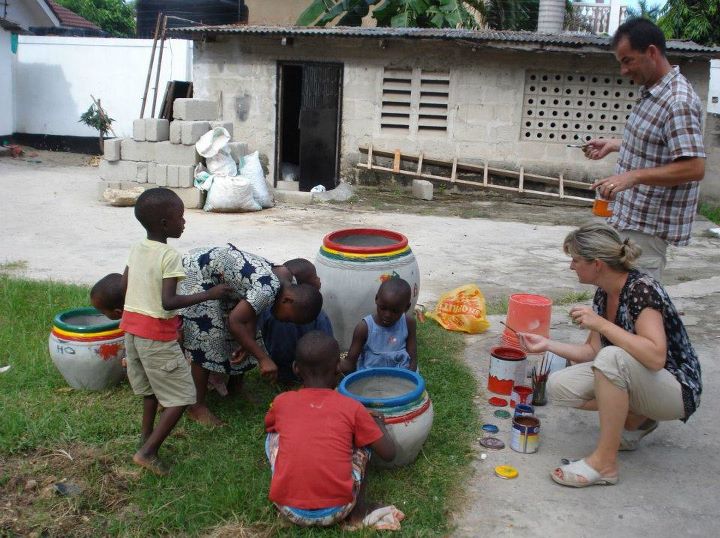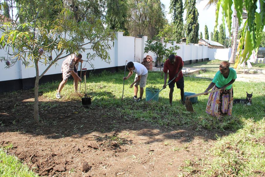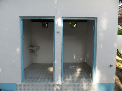In order to begin with their second big project – a covered washing place for the mamas – the bathroom for Patrick, our assistant manager and his family had to be built. After some serious problems with the pipe system (it broke three times in a row, normal routine here in Africa because of wrong spare parts and unskilled plumbers!) it turned out pretty well: Papa Patrick, Mama Grace and little Osman are very happy about their new bathroom, painted in white and blue with lovely tiles on the floor. Now we are working on the washing place, about which you’ll be informed more in detail in our next blog.