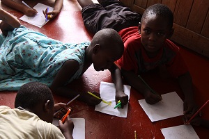 Besides that horrible occurrence, the first week for the children has been a very happy one. They have been playing with the neighborhood kids and have made several new friends. They spend their mornings doing writing exercises with the mamas and art classes with me. Afternoons are spent playing football with the neighborhood kids on the field across the street and sometimes watching cartoons (if we have power). We are preparing their records in cooperation with the Friends of Don Bosco so that they may enter school as soon as possible.