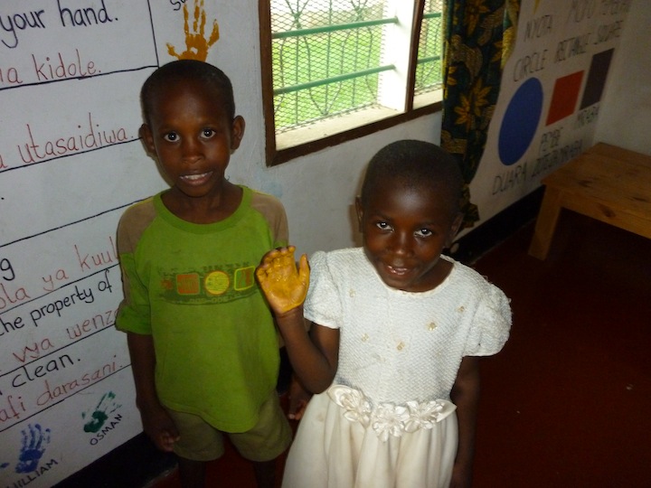 This week brought besides the rains (we are now in the midst of the rainy season) a lot of new things.  It’s nice to see that our home is constantly filling with new happy children’s voices. When I arrived there were only 13 kids and now there are already 19! Just last week, two new children arrived from Moshi – a small town in northern Tanzania at the foot of Mount Kilimanjaro. It’s really cool that the “catchment area” of the help2kids center continues to grow constantly. Our two new charges are the 6-year-old Heike and the 8-year-old Augusti. In the picture you can see how they perpetuate their fingerprints in the classroom 😉