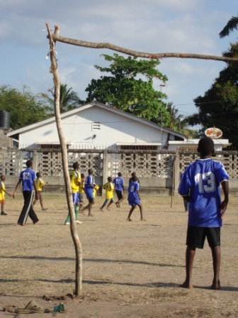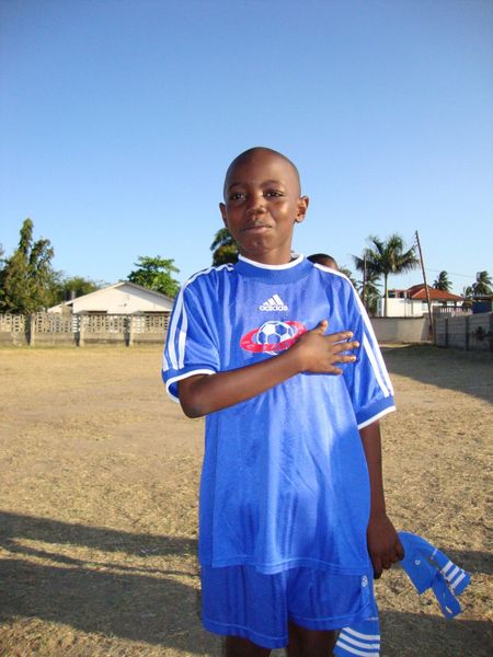 At another occasion, just besides the sand seller, we passed a dried out patch of dirt that once used to be grass. On a closer look we saw some kids building together a soccer goal from some tree branches. We stopped the car to talk to them and found out they were a bunch of friends that met every day after school (for the ones that are lucky enough to be able to go there) to play. I asked them if they had a ball, which they declined and showed me that they played with some self made ball. I promised to come back the next day to bring them a small surprise. Before I left Switzerland I was glad enough to receive some unused sets of jerseys and real soccer balls of my football club in Embrach. Also, Patrick knows the coach of “Mbezi Beach FC”, a club in our neighbourhood. They too, even though they play in a regular championship, do not have jerseys to play with. So the following day I filled the car with 4 sets of jerseys, shorts and socks and 3 soccer balls, and we set out to distribute them. It is difficult to describe the joy of the kids and the sparkling in their eyes when they received a complete set of jerseys and a real ball on top. Moreover, because we’ve found 2 groups of boys in our neighbourhood, we were even able to arrange a friendly game between them for the following day at 4 o’clock. I promised to be the referee in that game. It turned out that a referee was indeed needed, since the game (it was two neighbouring hoods, so maybe to be compared to a game FC Embrach vs. FC Bülach) was taken very seriously, and when finally the first side opened the score, their goal celebration was like coming straight out of the “Coca-cola” TV-advertisement with Roger Milla… Only once I was allowed to quickly stop the game (when I wanted to whistle for break and change of sides after 30 minutes, they said no, we just play on…) and that was when a small herd of cows and goats crossed the field. A big thank you again to Dani Fischer and the whole of FC Embrach for the generous gift which I can promise is in very good hands.