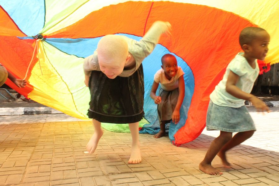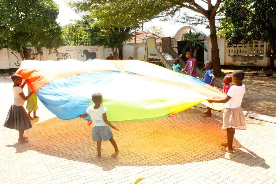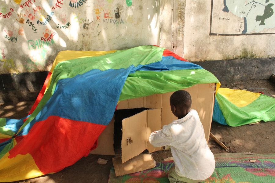 During a week of vacation, the kids took out the parachutes and endlessly enjoyed hiding underneath the colored fabric and giggling until someone on the outside tapped their heads and called their names. The enthusiastic game of tag that followed left everyone exhausted but smiling. Prisca and Agusti built themselves a little house from the leftover cardboard boxes. It even had a little door!