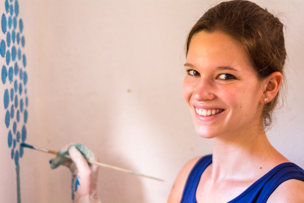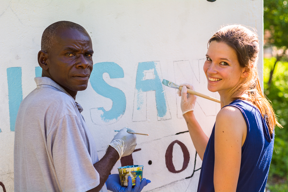 Anja spent every morning assisting the teachers with the children at Chisomo, and every Friday afternoon painting the toilet with help2kids staff and Mr. Yona, our “local volunteer”. The messages: “Wash your hands with soap” and “use the toilet” were painted in the ChiChewa language along with pictures of happy soap characters, and taps for handwashing. As the vibrant words took shape on the bright white walls, we could hear students from the neighboring primary school reading the slogans aloud.