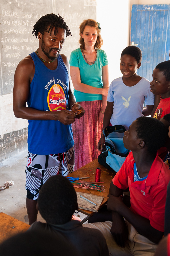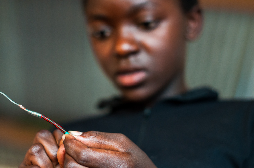 | After the somewhat intense unit on abstinence, help2kids arranged a fun activity for the Toto Club members to tie everything together. Mr. Papaya, a local craftsperson came to teach the children how to make bracelets using insulated wire and thread. While the activity was slow-going and frustrating at first, as the bracelets took shape, looks of satisfaction and accomplishment came over their faces. The entire time, Mr. Papaya circulated the room offering assistance and advice. The bracelets symbolize either their pledge to remain abstinent until marriage or to do everything in their power to prevent HIV, and are now their badges of membership. |